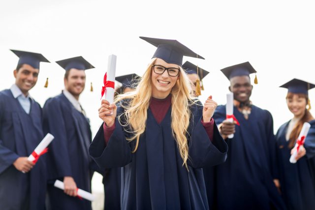 a group of people in graduation gowns holding diplomas.